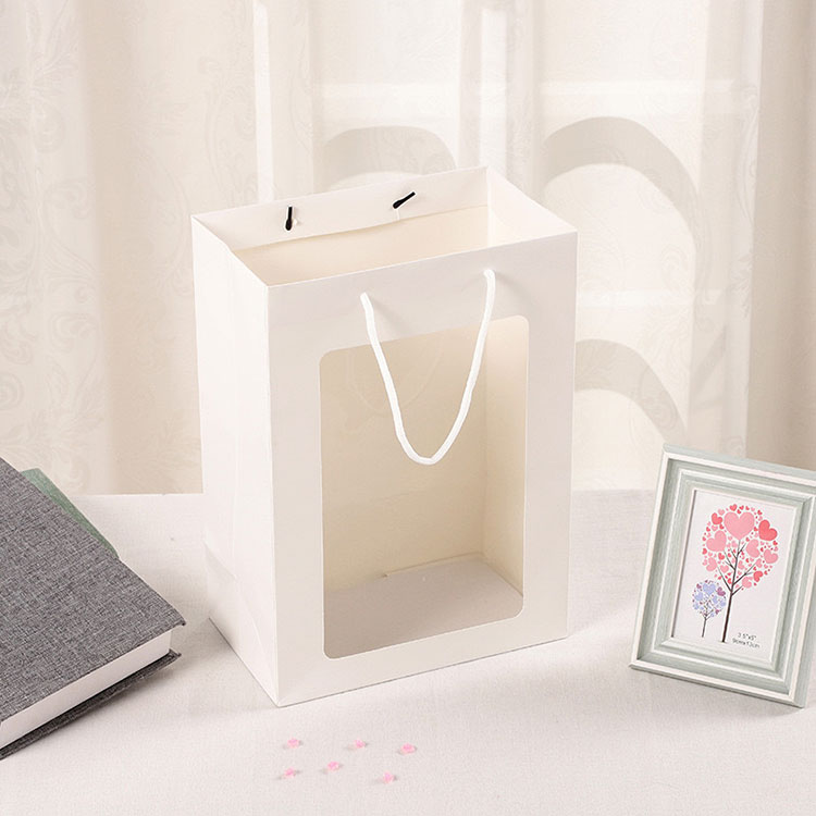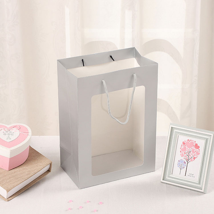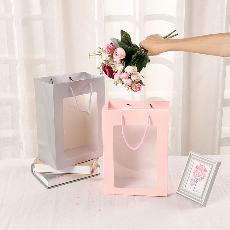 De afmetingen van de papieren bloemencadeauzakjes zijn 35*25*15cm. Wij accepteren ook aangepaste formaten. Wij hebben papieren zakken op voorraad in vier kleuren. Een rechthoekige tas met twee gedraaide touwen, de kleur van de touwhengsels komt overeen met de kleur van het taslichaam. Veel klanten gebruiken de tassen als papieren cadeauzakjes voor kinderen. Eén kant van de tas is transparant, waardoor een intuïtiever zicht op de items erin mogelijk is. Als fabriek en leverancier van papieren zakken is maatwerk acceptabel. We kunnen ook een bestaand gratis monster aanbieden.