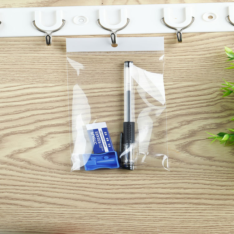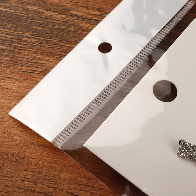 Er zit een ophanggat aan de bovenkant van de OPP Head Card Bag, wat handig is om na het verpakken aan de muur of in de schappen van supermarkten/winkels te hangen. De meeste gaten in opp-tassen op voorraad zijn rond, maar we kunnen er andere vormen van maken als onze klanten anders willen zijn met het gemeenschappelijke ontwerp.
