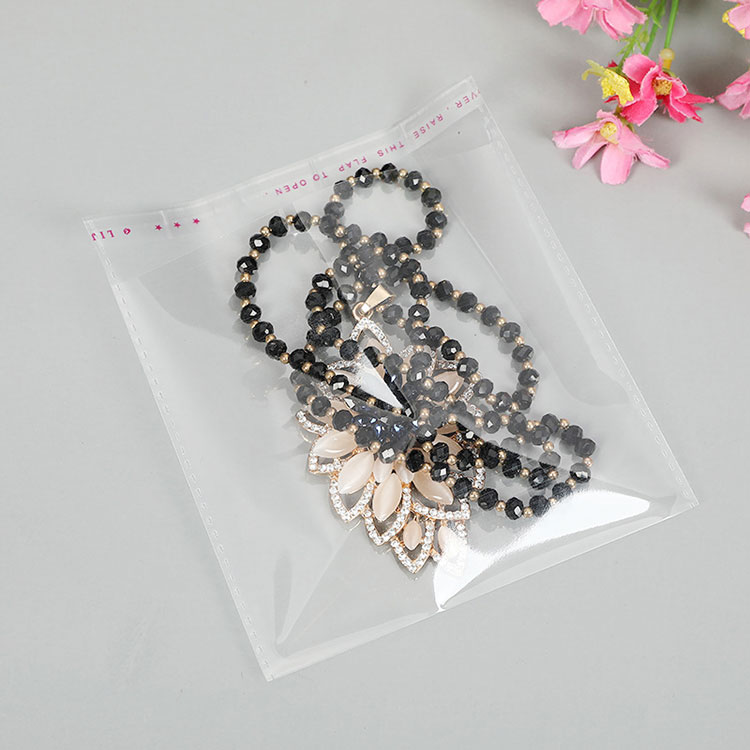Dit soort OPP zelfklevende tas is helder met afdichtingsband. Het is niet giftig, geurloos en kan de items erin tentoonstellen, geschikt voor het verpakken van kleding, handschoenen, sjaal, sokken, kaarsen, sieraden of make-upborstels enz. De tassen worden vaak gebruikt in de detailhandel voor het verpakken van verschillende producten, zoals kleine speelgoed, sieraden en briefpapier.