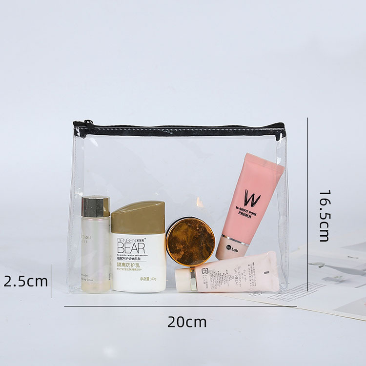 De maat van de PVC-tas met ritssluiting in onze voorraad is 20*2,5*16,5 cm, deze past op de meeste cosmetica op de markt, tenzij individuele cosmetica relatief groot zijn, waardoor ze misschien niet passen. Maar omdat we een fabrikant zijn, kunnen we verschillende maten aanpassen aan de behoeften van de klant, naast het aanpassen van de I-maat, maar ook de vorm kan worden aangepast.