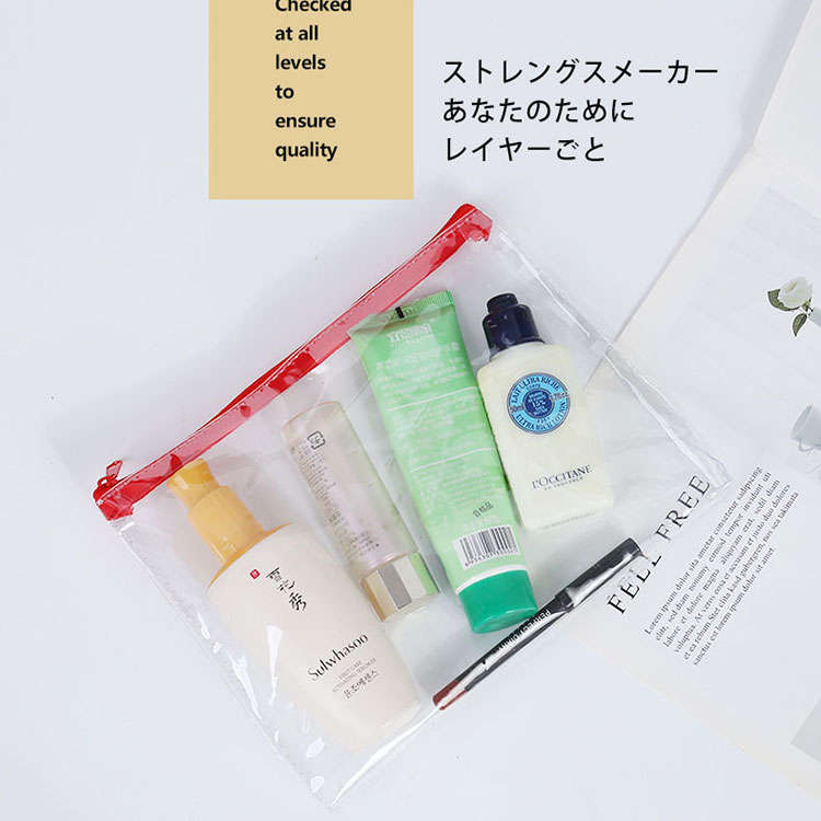 De PVC-tas met ritssluiting is waterbestendig en kan worden gebruikt om uw schoonheidsbenodigdheden op reis in op te bergen, zoals deodorant, tandpasta, make-up en huidverzorgingsproducten. De tas is transparant, zodat je kunt zien wat erin zit en je de tas snel en efficiënt kunt inpakken.Als je de pvc-tassen met ritssluiting in je koffer stopt, zijn ze goed voor het organiseren van je toiletartikelen en handig om spullen uit de tassen te halen en te plaatsen.
