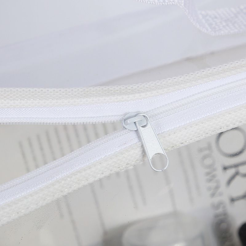 Onze ritssluiting is ontworpen om erg lang te zijn, alle drie de zijden zijn gemaakt met ritssluiting, dus de opening is vrij groot. Het is gemakkelijker om dingen in de Clear Bag te doen of eruit te halen, vooral als u spullen zoals lakens of dekbedden opbergt. De rits wordt soepel gebruikt en geeft je geen slechte ervaring, hij blijft bijvoorbeeld hangen als je de tas opent of sluit. De ritstas op de foto is gemaakt in het wit met witte rits, maar we kunnen de kleur naar keuze aanpassen, zoals een groene tas met groene rits, rode tas met rode rits, blauwe tas met blauwe rits, enz.