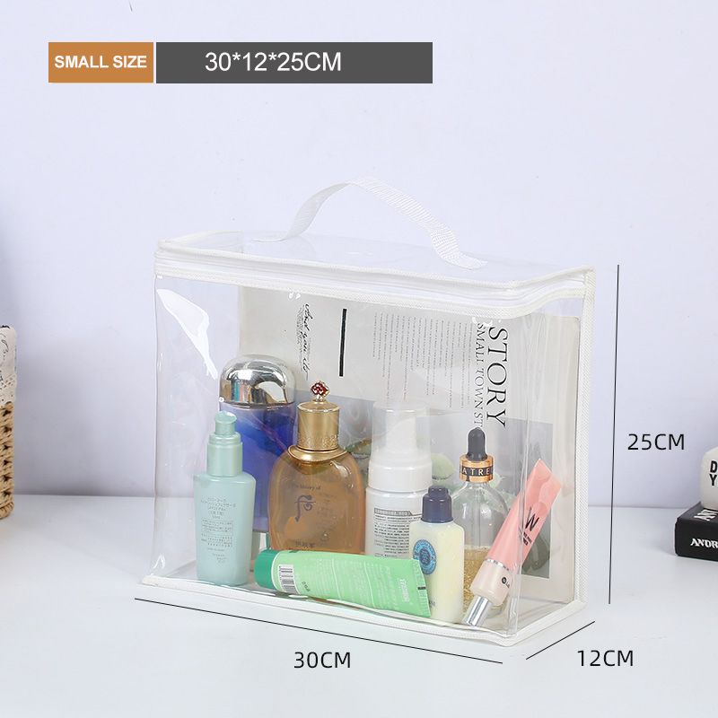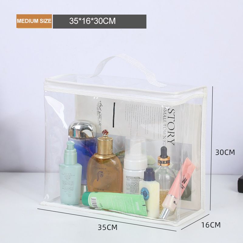 AlsPVC doorzichtige naairitszakheeft sterke naden, de steken komen er niet uit. We voegen een handgreep aan de bovenkant van de doorzichtige ritszak toe, zodat u de doorzichtige PVC-tas gemakkelijk kunt dragen. De tas kan een aanzienlijk gewicht dragen en kan zware voorwerpen bevatten, zoals mineraalwaterflessen, colablikjes en drankflessen.